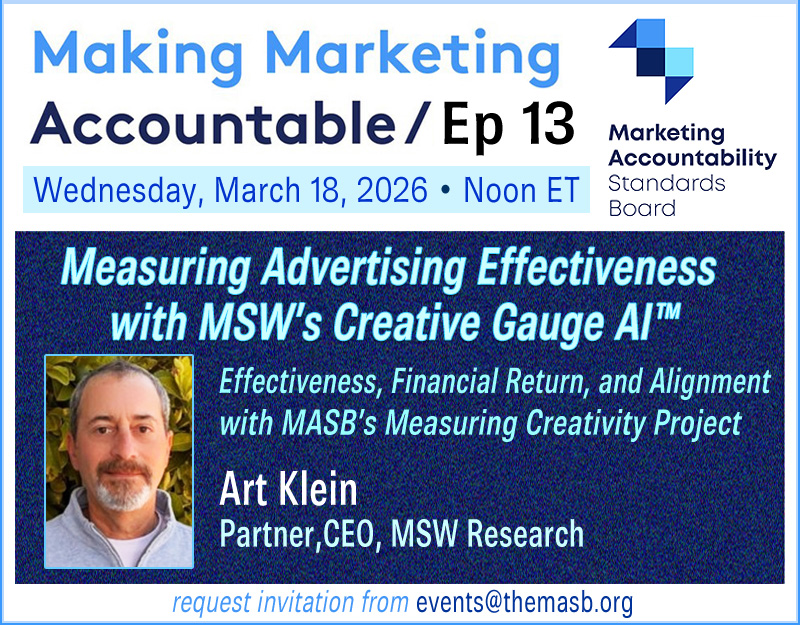 Creativity is often celebrated in advertising, but how should it actually be measured? MASB’s Measuring Creativity Project defines creative effectiveness as the combination of originality and real business impact. In this webinar, Art will discuss how MSW’s Creative Gauge AI™ aligns with these principles and uses decades of empirical research on advertising content to evaluate creative effectiveness. The session will explore how marketers can better understand the relationship between creative decisions, advertising effectiveness, and financial return.